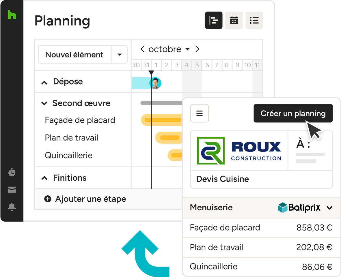 - Organisation optimisée : Planifiez chaque phase de votre chantier avec des tâches et des échéances basées sur vos devis.