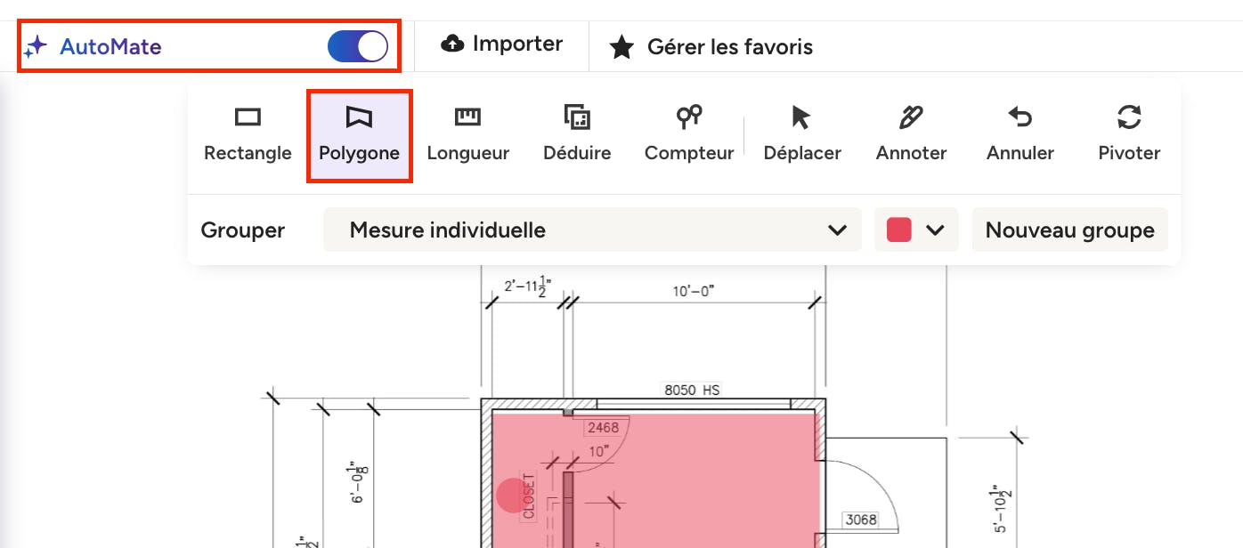 Pour les plans simplifiés : Cliquez sur l'icône du polygone, « Polygone », dans votre barre d'outils, puis sélectionnez le groupe auquel vous souhaitez ajouter les mesures. Survolez la zone que vous souhaitez mesurer sur votre plan et AutoMate détectera automatiquement l'espace. Un simple clic suffit pour confirmer et ajouter au répertoire des mesures.