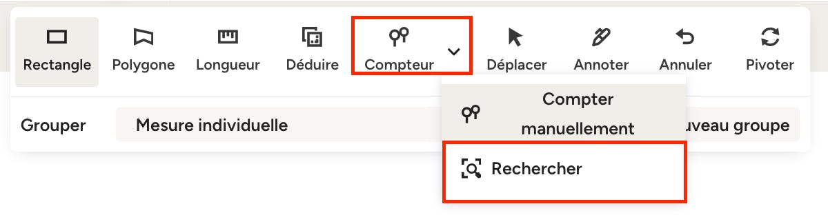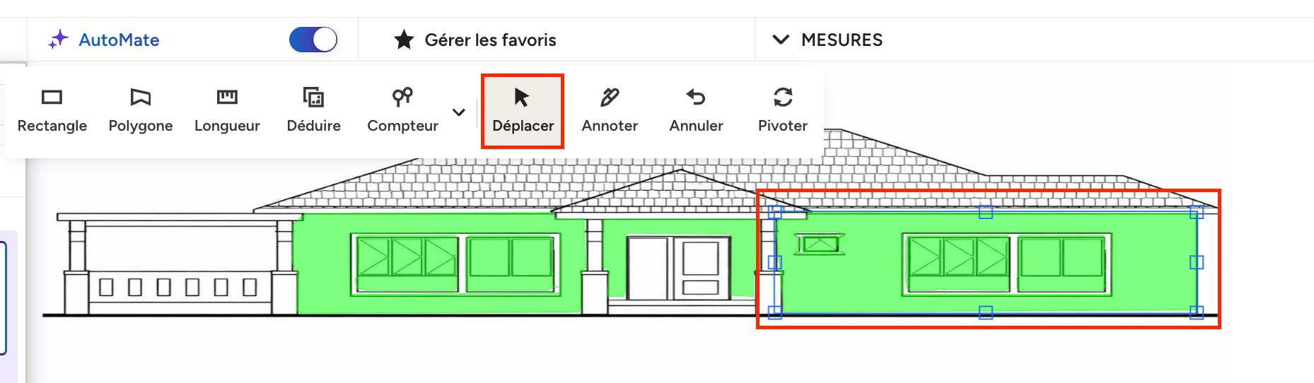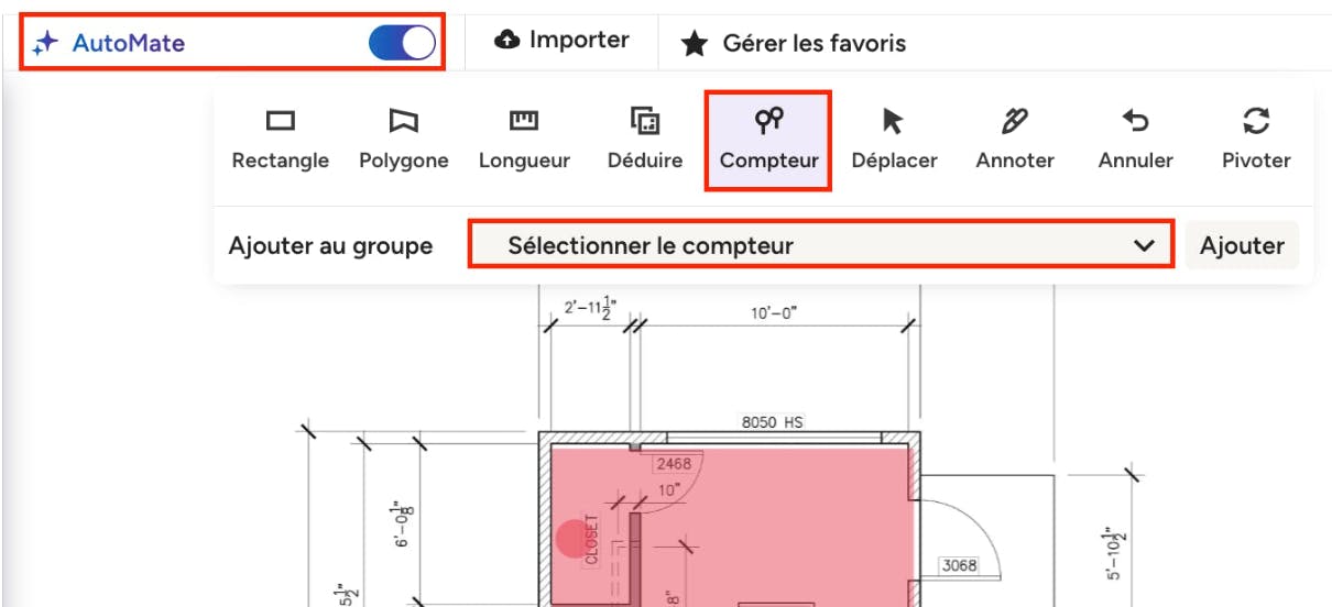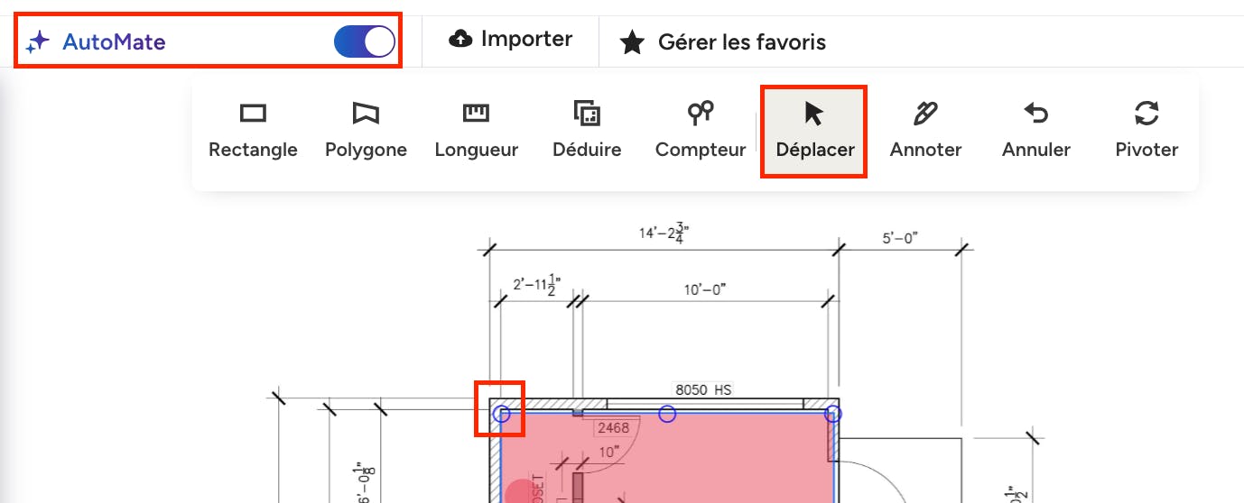 Vous aurez toujours la possibilité de mesurer tout ce qui se trouve sur votre plan à l'aide des outils manuels. Si vous avez besoin d'ajouter une mesure personnalisée, vous pouvez désactiver la fonction AutoMate et utiliser les outils comme d'habitude.
