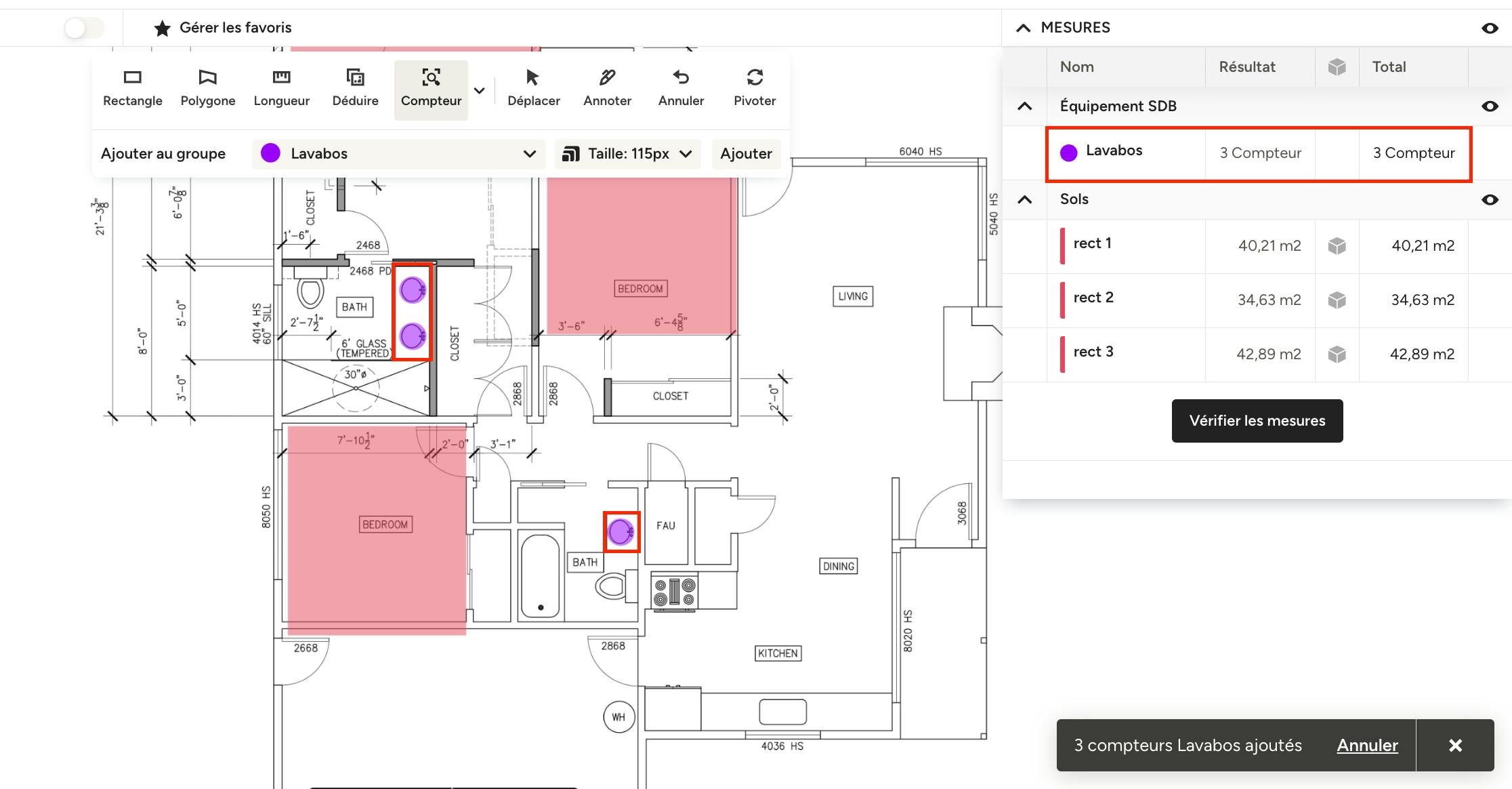 Vous pourrez désormais voir les icônes identifiées sur votre plan, et le nombre total de ce symbole apparaîtra dans votre panneau de mesures.