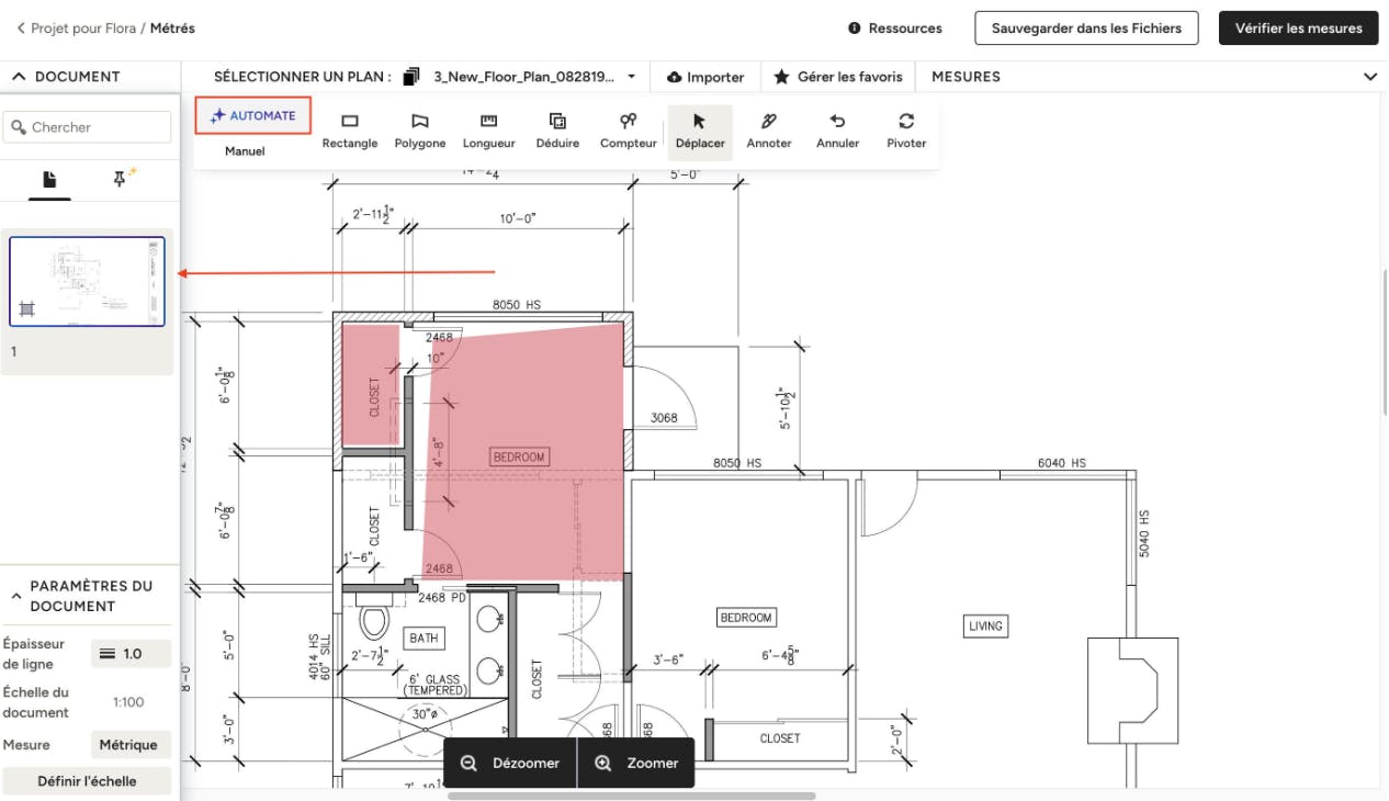 Comment ça marche : lorsque vous importez un ensemble de plans sur Houzz, notre système scanne les pages et, si possible, vous propose d'utiliser AutoMate pour accélérer le processus de métré. Bien que tous les plans ne soient pas éligibles à AutoMate (uniquement les plans simplifiés et les élévations pour le moment), vous pouvez activer l'option AutoMate en haut de votre métré pour voir quelles pages sont éligibles.