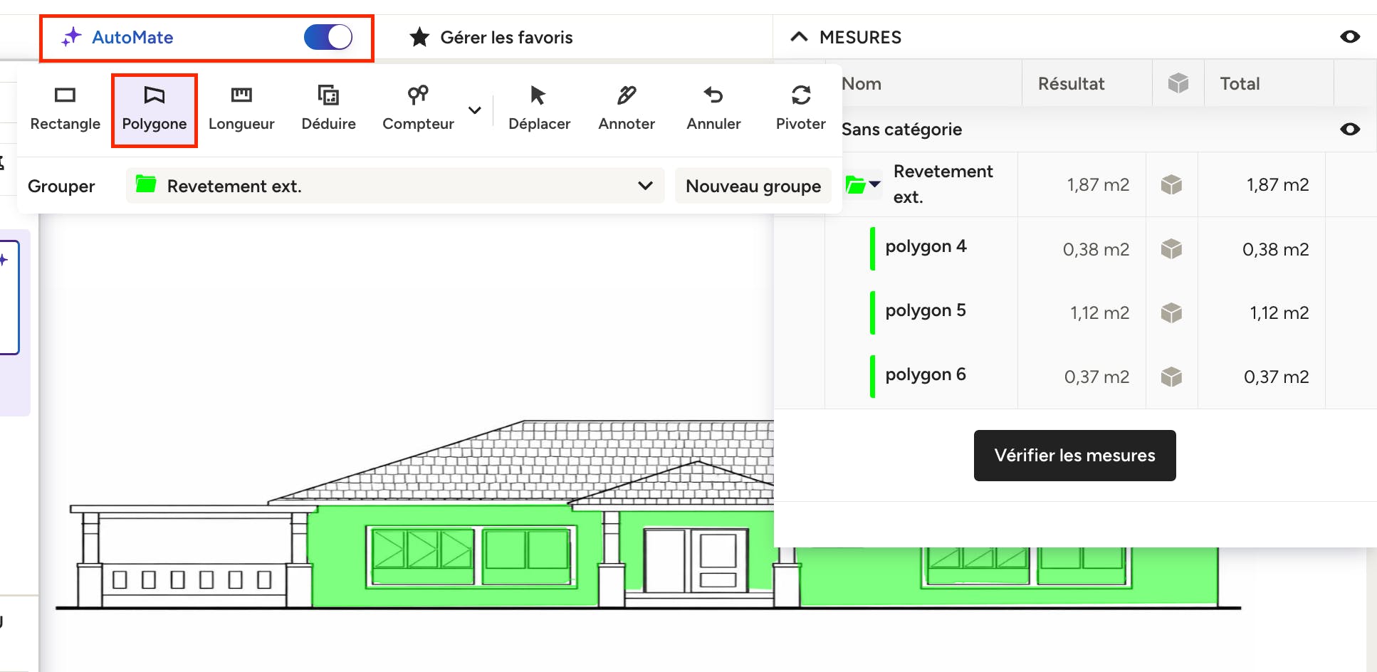 Pour les élévations : Si vous souhaitez utiliser AutoMate pour une élévation, la procédure est la même. Cliquez sur l’icône « Polygone » dans votre barre d’outils, puis sélectionnez le groupe auquel vous souhaitez ajouter les mesures. Survolez la zone à mesurer sur votre plan et AutoMate détectera automatiquement l’espace. Un simple clic suffit pour confirmer et ajouter au répertoire des mesures.