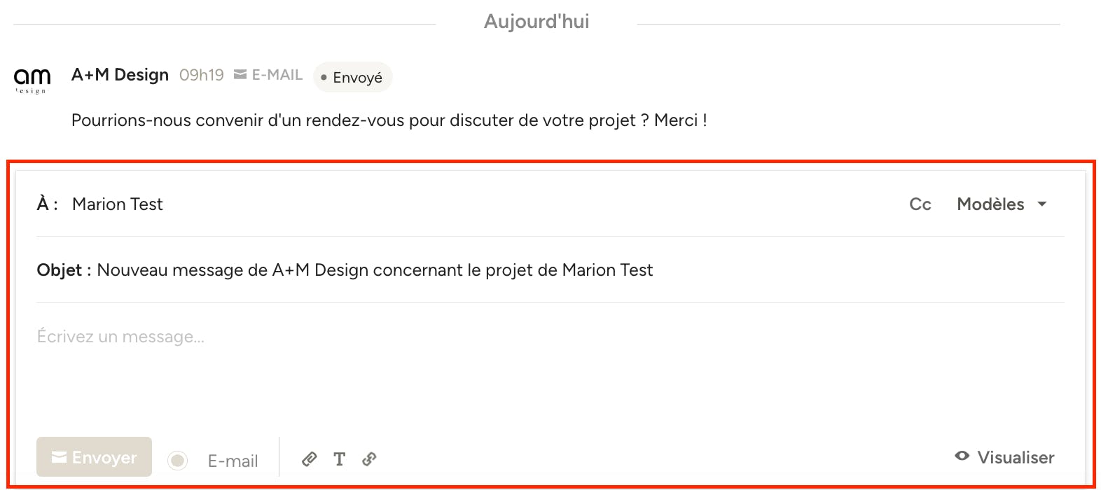 Dans « Messages », vous pouvez envoyer un e-mail, inclure des pièces jointes, ajouter des liens et bien plus encore. Vous pouvez également des modèles de messages personnalisés.