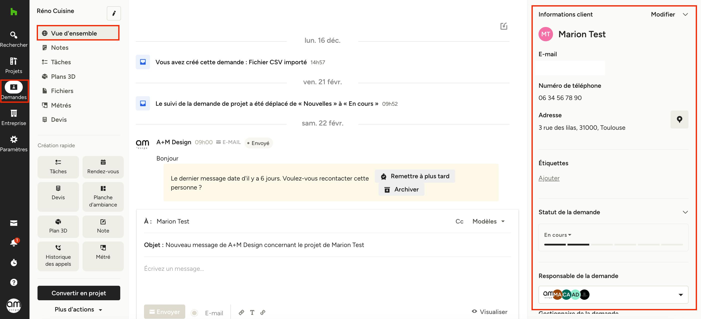 Sur la droite, vous pouvez consulter toutes les informations relatives au client et à la demande, notamment le statut, le responsable et le gestionnaire de la demande.