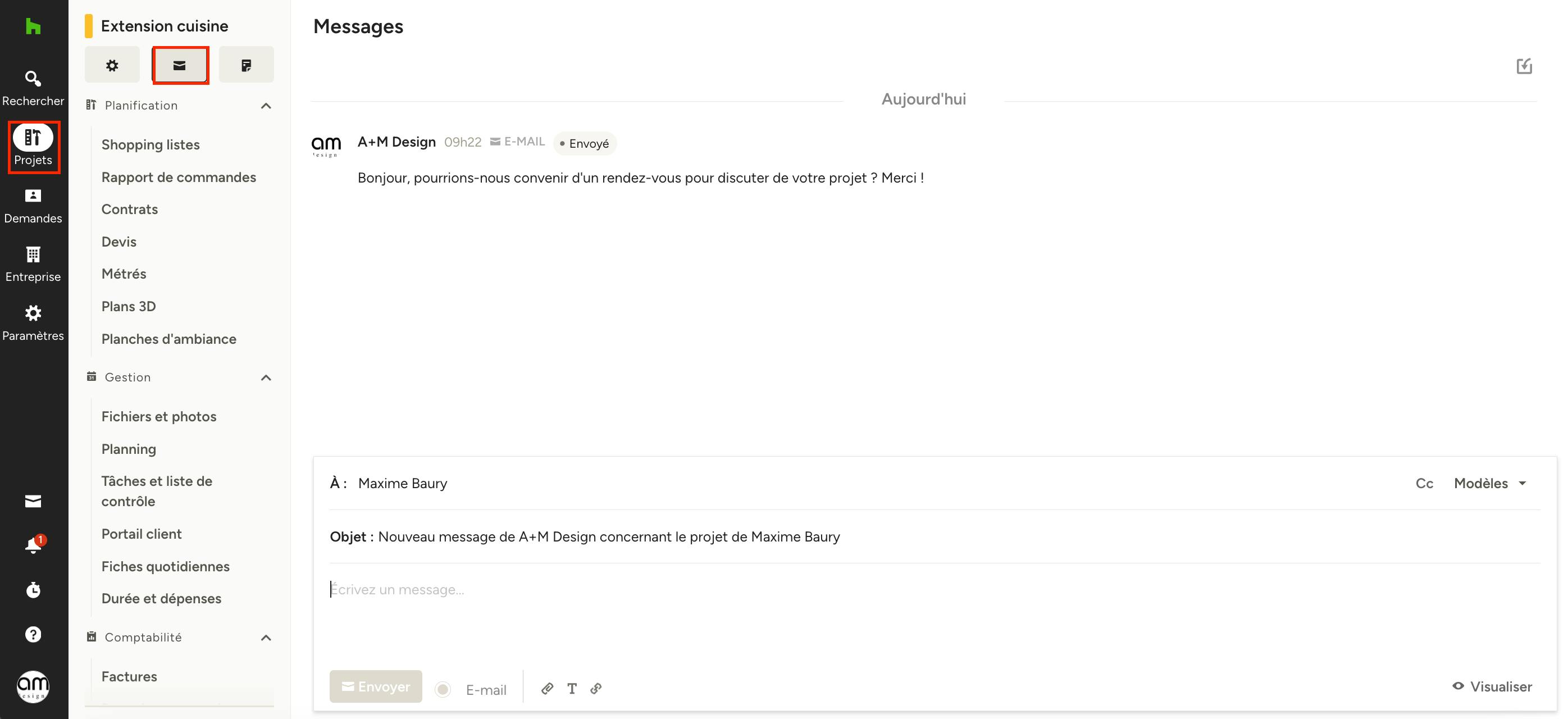 Pour envoyer un message à un client, sélectionnez le projet concerné depuis l'icône « Projets » dans le menu de gauche. Cliquez ensuite sur l'icône « Messages » sous le nom du projet.