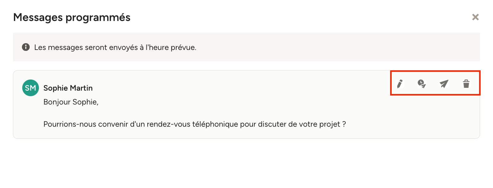 Dans la fenêtre des messages programmés, survolez un message pour afficher les options suivantes : Modifier le message, Reporter l'envoi, Envoyer maintenant et Supprimer le message.