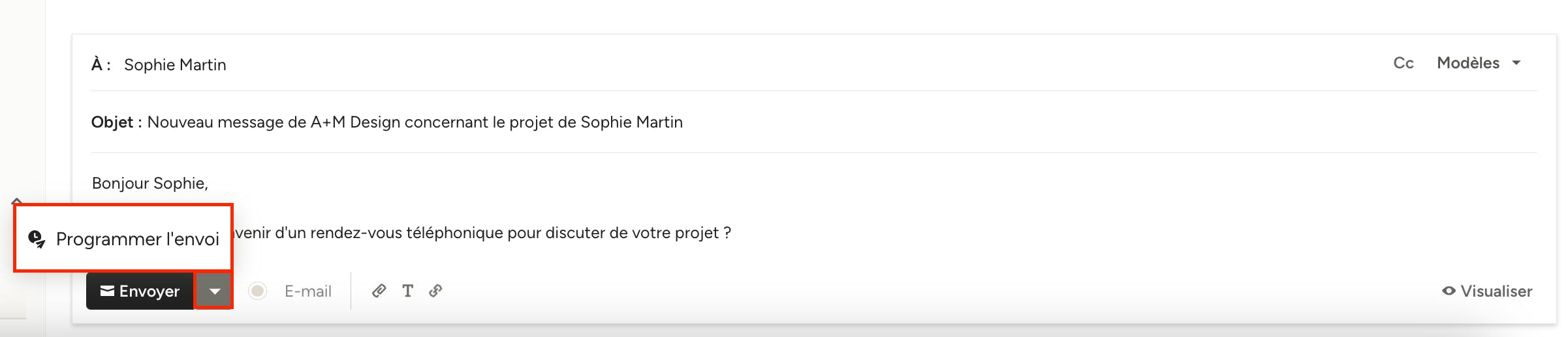 Pour planifier l'envoi d'un message à une date ultérieure, commencez par rédiger votre message à l'intention d'un prospect ou d'un client comme indiqué ci-dessus (vous pouvez le modifier à tout moment avant la date et l'heure programmées). Ensuite, cliquez sur la flèche à droite du bouton « Envoyer » et sur « Programmer l'envoi ».