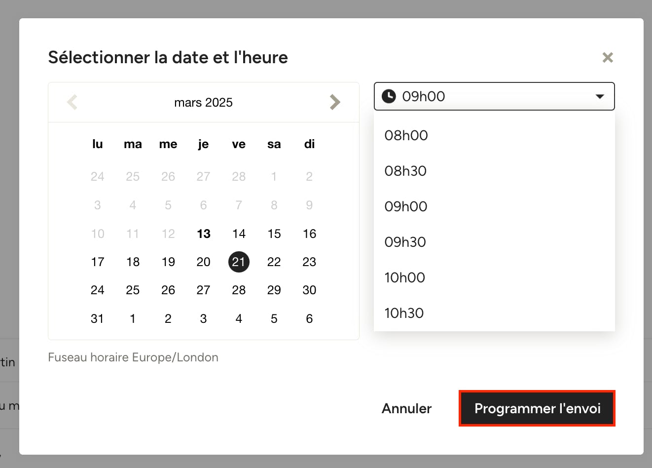 Choisissez la date et l'heure d'envoi du message, puis cliquez sur « Programmer l'envoi ».