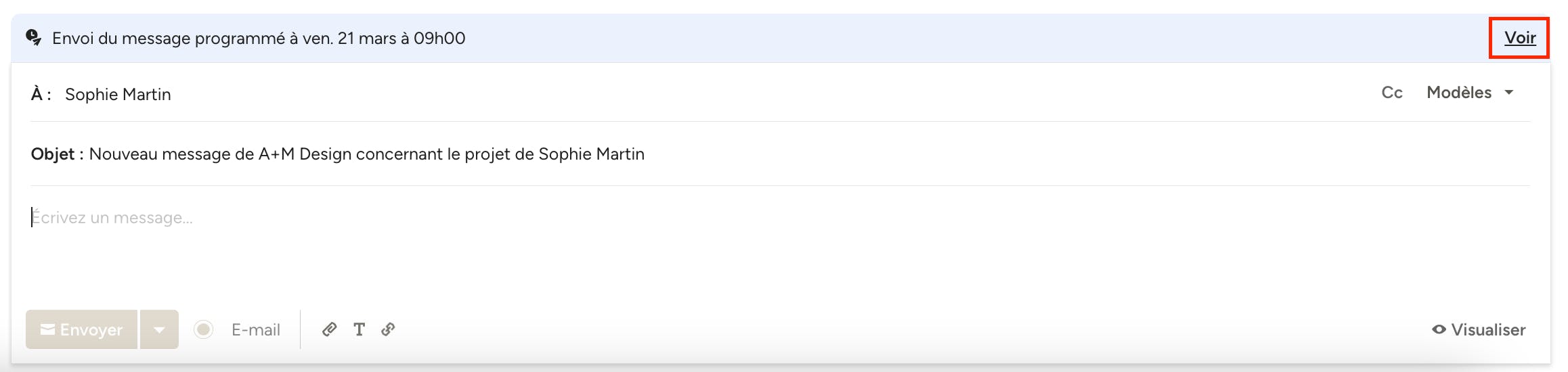 Les détails de l'envoi programmé s'affichent en haut du bloc où vous écrivez les messages. Vous pouvez cliquer sur « Voir » à droite pour consulter tous les messages programmés pour le prospect/client, et apporter des modifications ou des ajustements au calendrier si nécessaire.