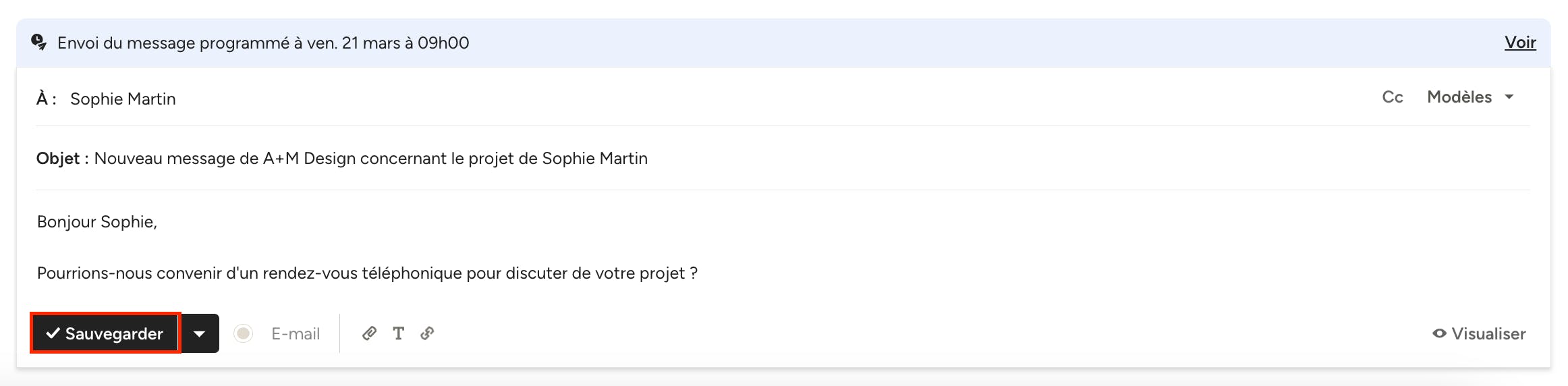 Grâce à la possibilité de programmer l'envoi de messages à une date et une heure précises, vous pouvez rédiger et enregistrer des messages au moment qui vous convient le mieux, puis choisir le meilleur moment pour les envoyer à votre client ou prospect. L'envoi programmé fonctionne avec les modèles et les e-mails.