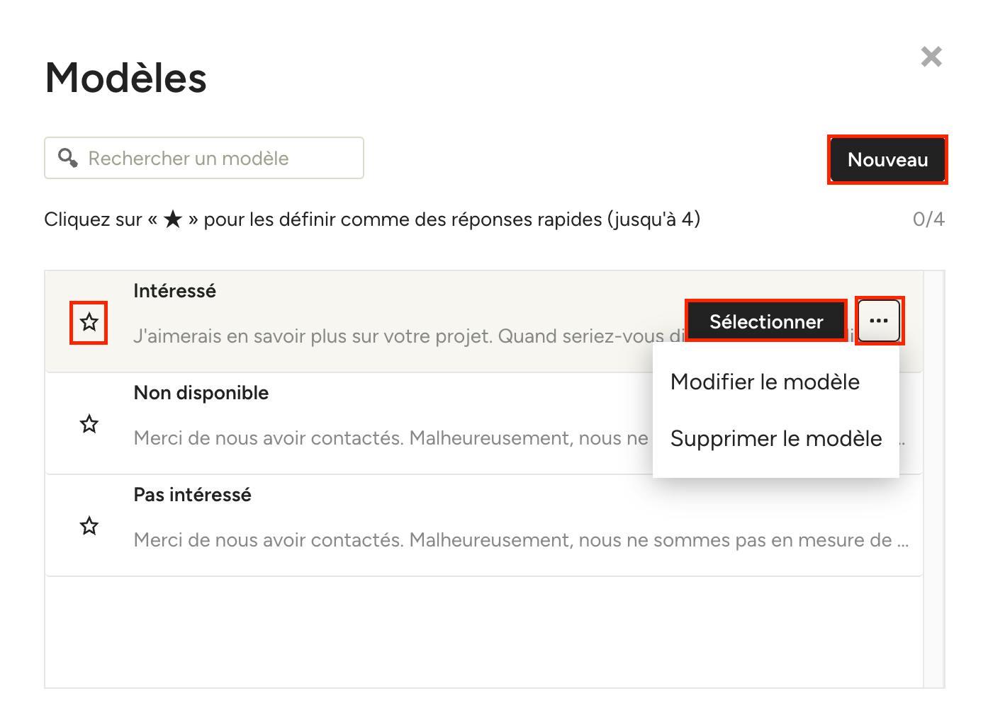 Si vous souhaitez utiliser un modèle de message comme option de réponse rapide, cliquez sur l'étoile à gauche du modèle (vous pouvez sélectionner jusqu'à quatre modèles par défaut).