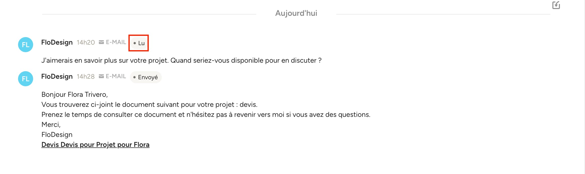 Dans la section « Messages », vous pouvez consulter tous vos messages existants avec ce prospect.