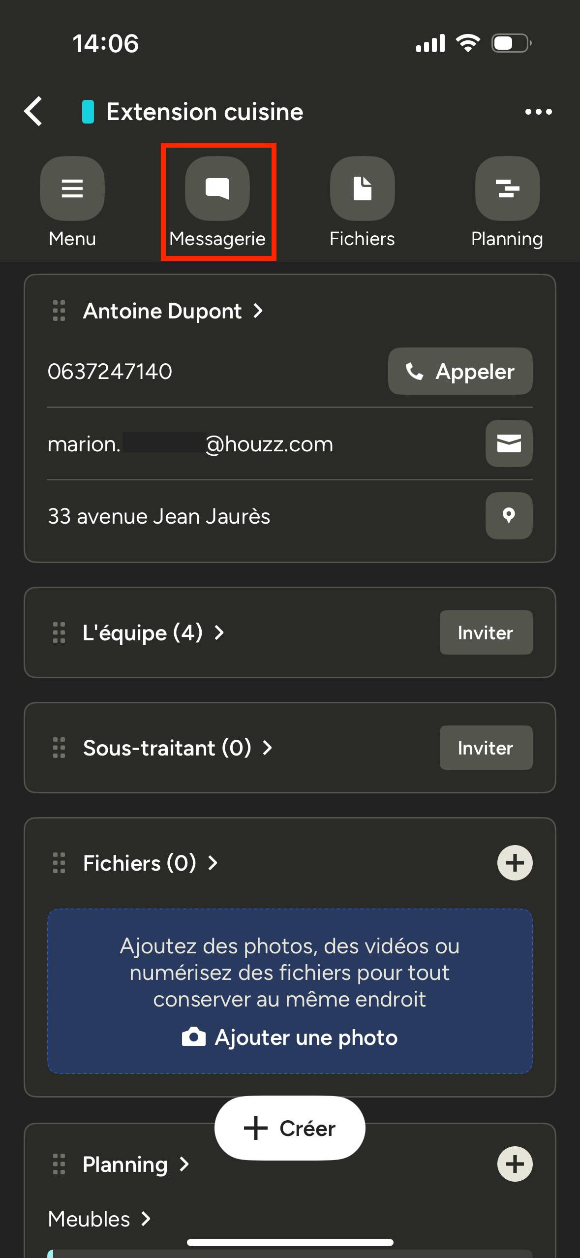 Pour envoyer un message à un prospect ou à un client sur l’application Houzz Pro, sélectionnez l’icône « Projets » ou « Demandes » dans le menu du bas, puis choisissez le prospect ou projet concerné.