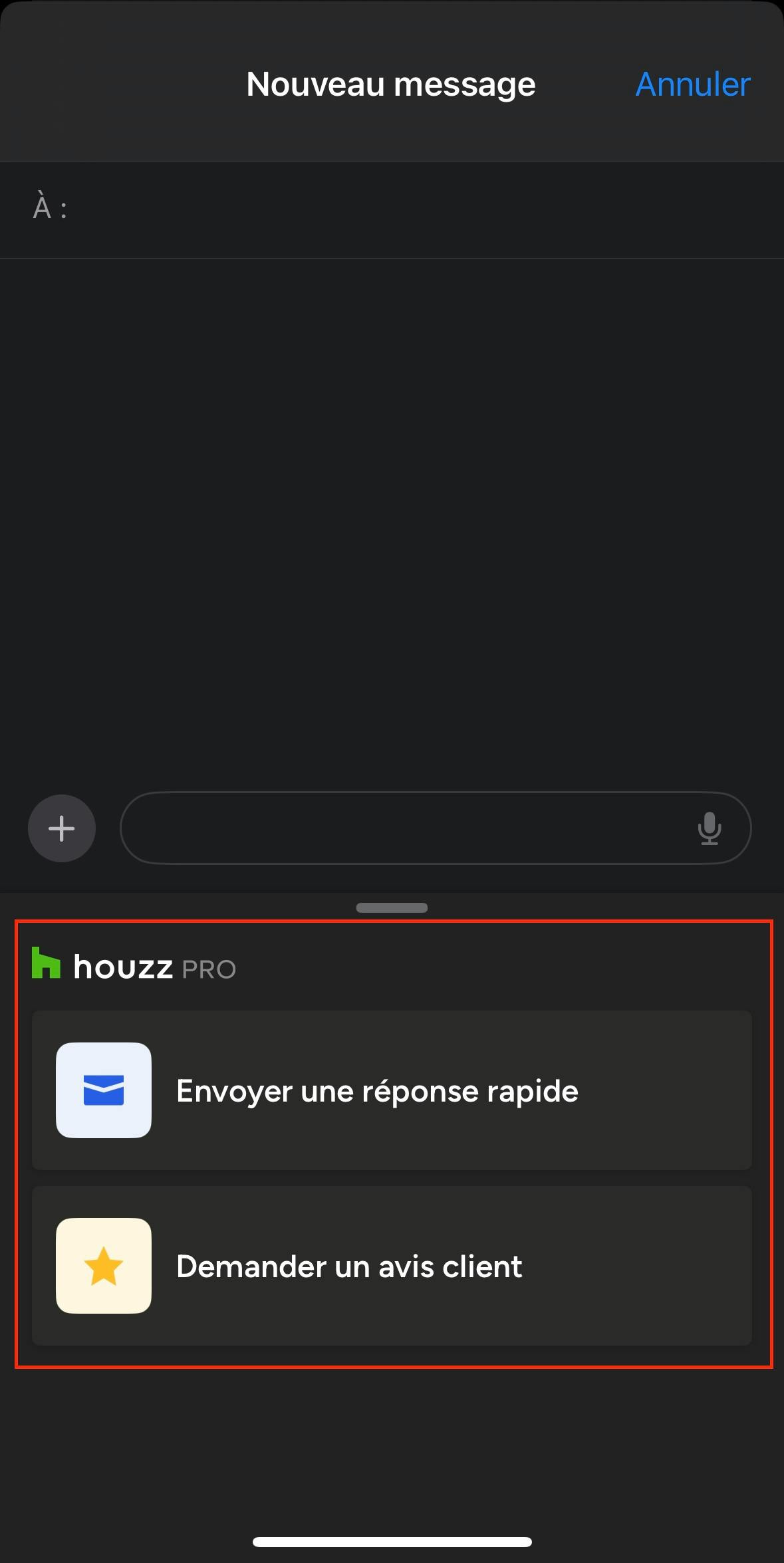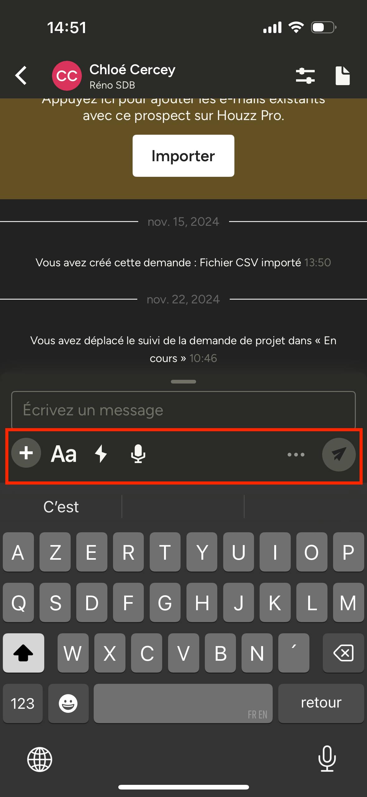 Toutes les actions sont automatiquement synchronisées avec Houzz Pro : cela vous aide à rester organisé, à réduire la saisie manuelle de données et à offrir une expérience de communication rapide et soignée.