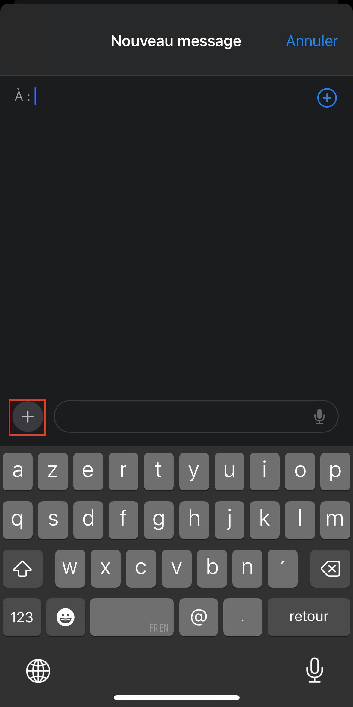 Pour y accéder, ouvrez l’application Messages sur votre appareil iOS, puis la conversation concernée. Cliquez ensuite sur le signe « + » situé à côté du champ de saisie du message.