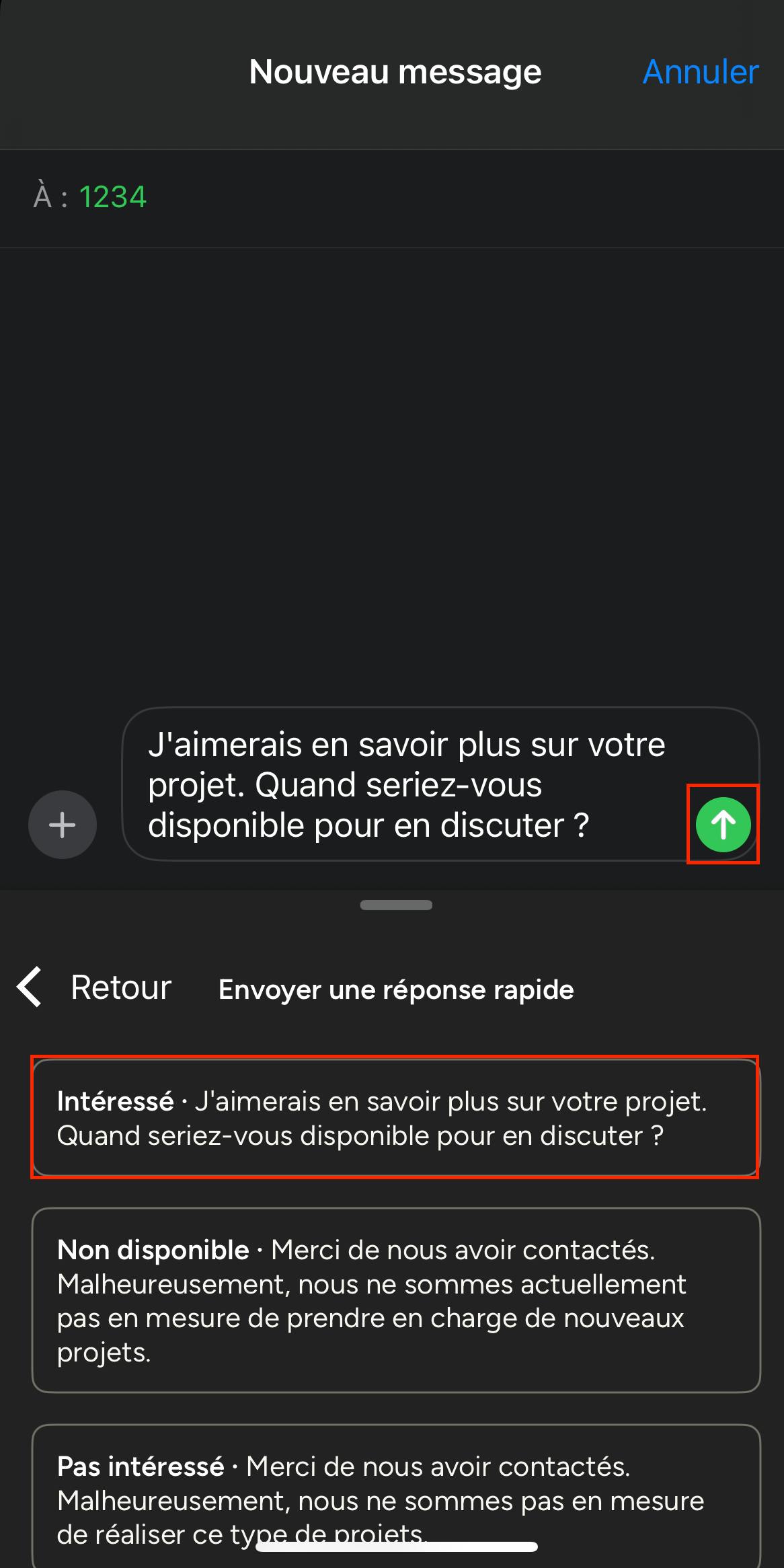 Si vous sélectionnez « Envoyer une réponse rapide », plusieurs réponses prédéfinies s’affichent afin de vous permettre de répondre rapidement à un prospect. Lorsque vous choisissez une réponse, le message se remplit automatiquement dans le champ de saisie.