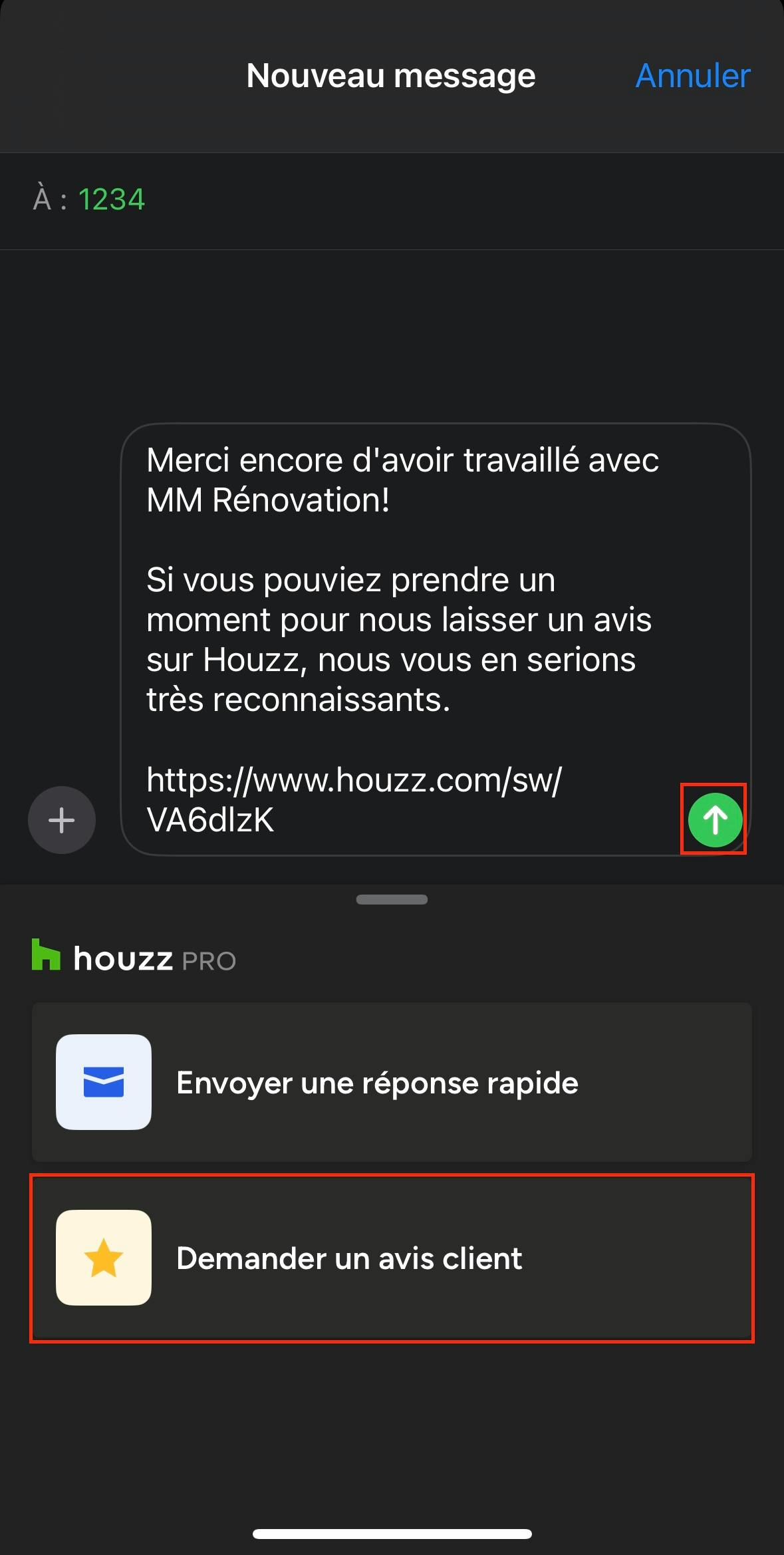 Vous pouvez ensuite personnaliser le message si nécessaire, puis cliquer sur le bouton Envoyer (la flèche) une fois terminé.