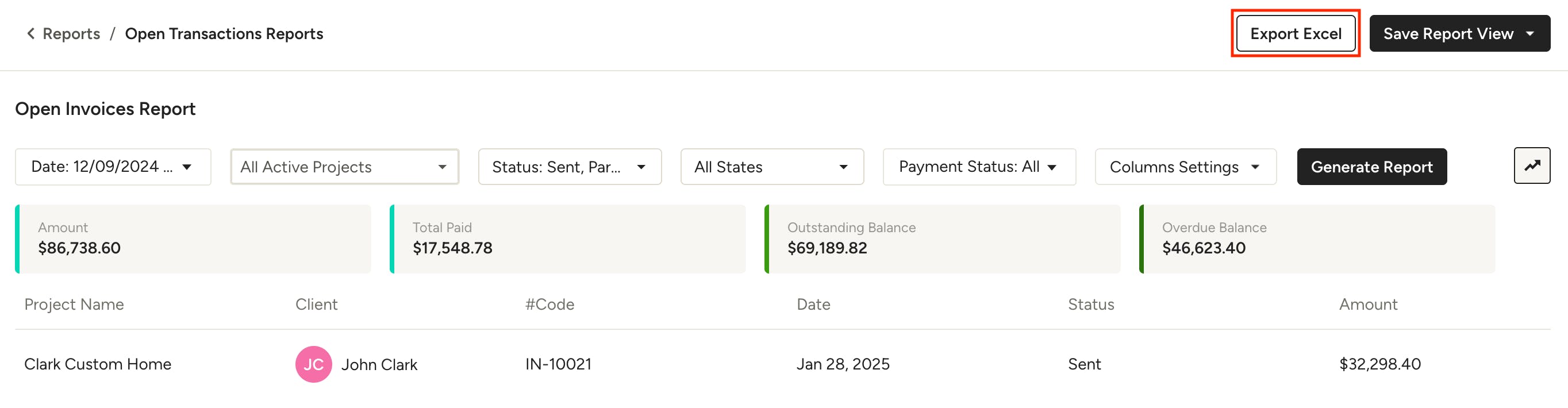 Une fois dans le rapport, vous verrez un résumé des totaux pertinents en haut, ainsi qu’une répartition des documents en cours avec leurs détails de paiement. Cliquez sur un nom de projet ou un code de document pour accéder directement à ce document.