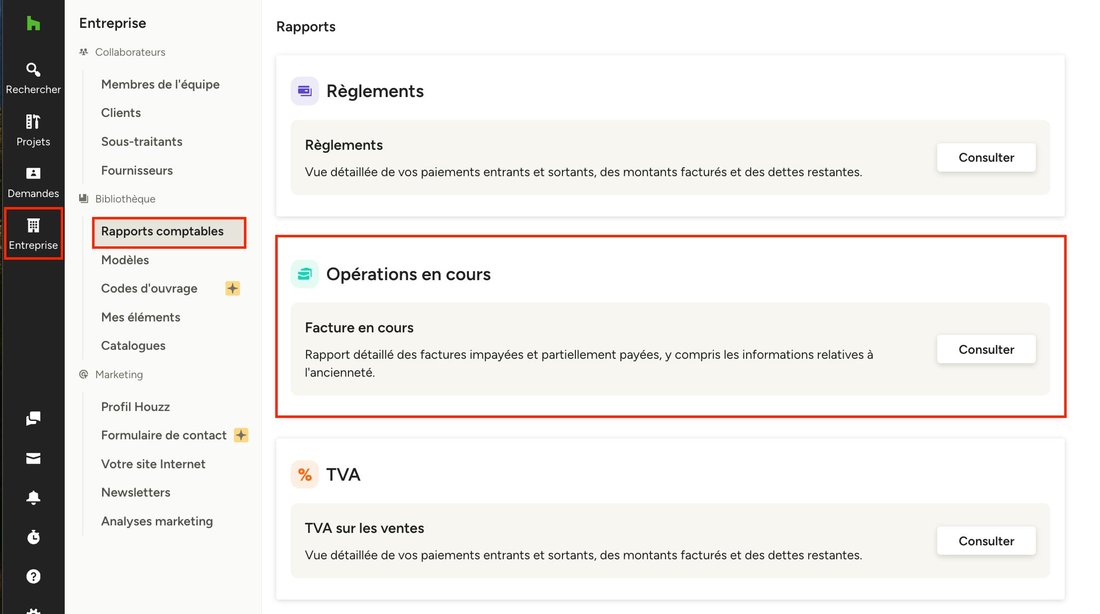 Cliquez sur l'icône « Entreprise » dans la navigation de gauche, puis sélectionnez « Rapports comptables » dans le menu de gauche. Ensuite, cliquez sur « Consulter » dans la section des Opérations en cours, pour ouvrir le type de rapport que vous souhaitez ouvrir.