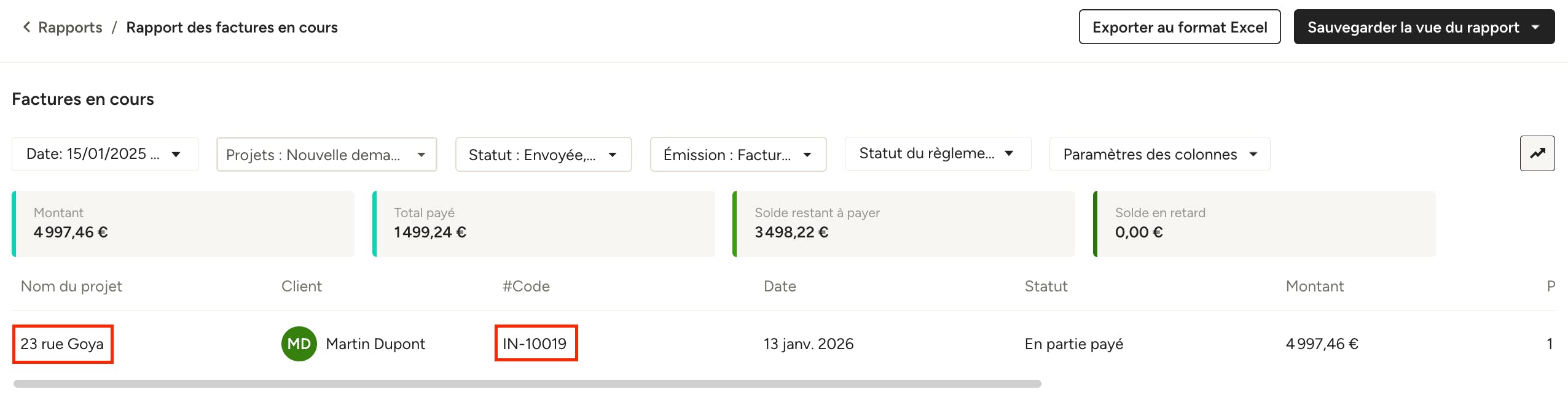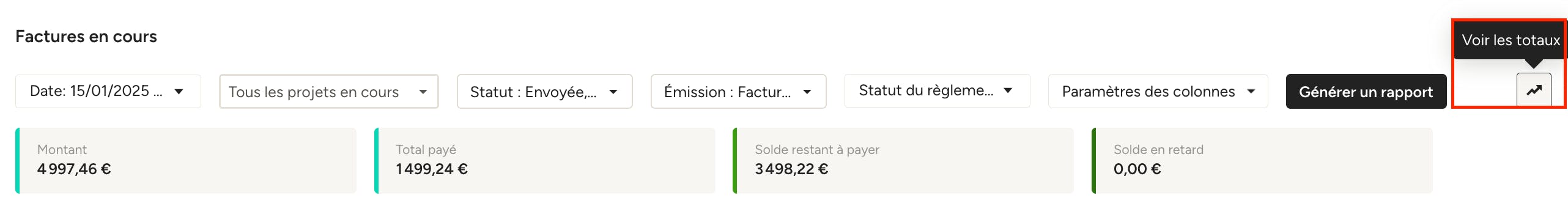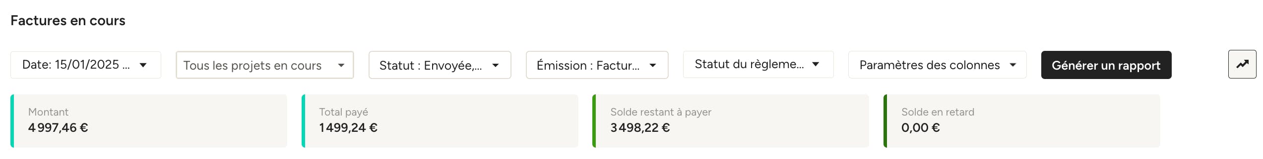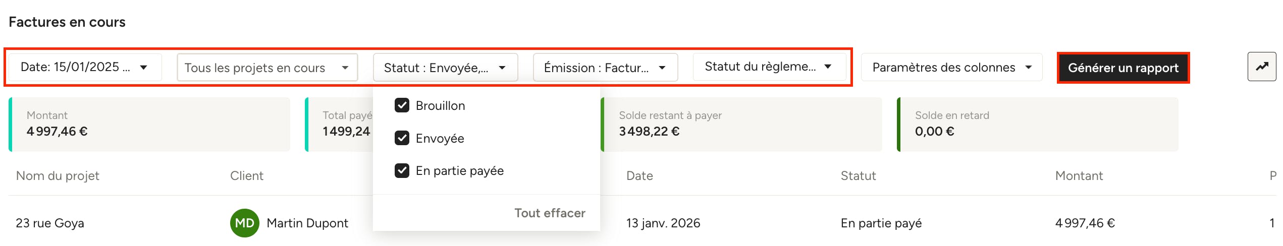 Vous pouvez affiner les résultats à l’aide des différents filtres situés en haut du rapport : date, projet, statut (brouillon, envoyé, en partie payé), émission (émise ou non émise) et statut du règlement (toutes les factures, solde dû, factures en retard).