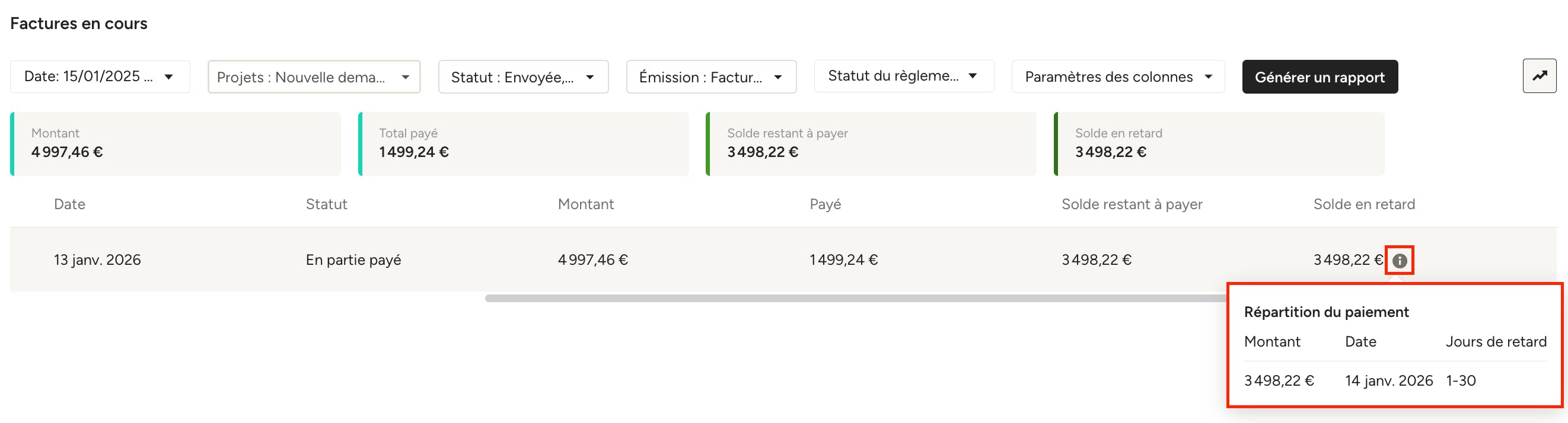 Cliquez sur l’icône d’information dans la colonne « Solde en retard » pour voir la répartition des paiements, y compris le nombre de jours de retard.