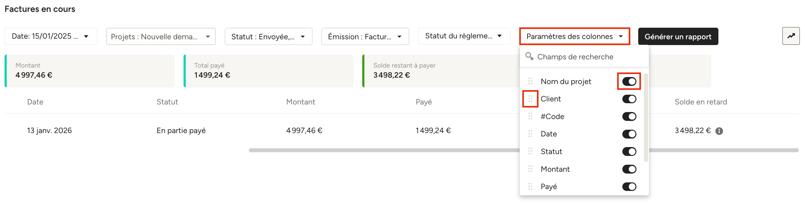 Faites glisser horizontalement pour voir toutes les colonnes disponibles, notamment « Solde restant à payer » et « Solde en retard ». Vous pouvez aussi personnaliser les colonnes visibles, et leur ordre, via le menu « Paramètres des colonnes » en haut du rapport (voir la section ci-dessous).