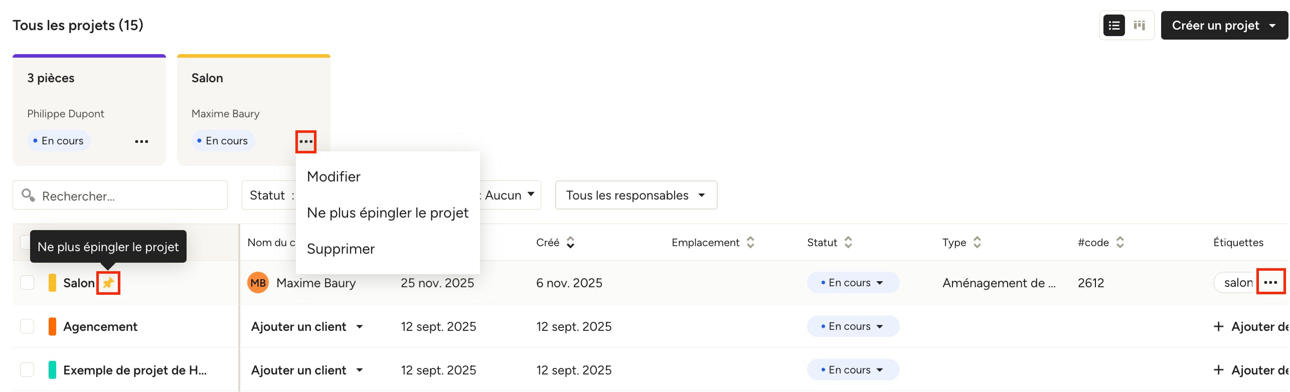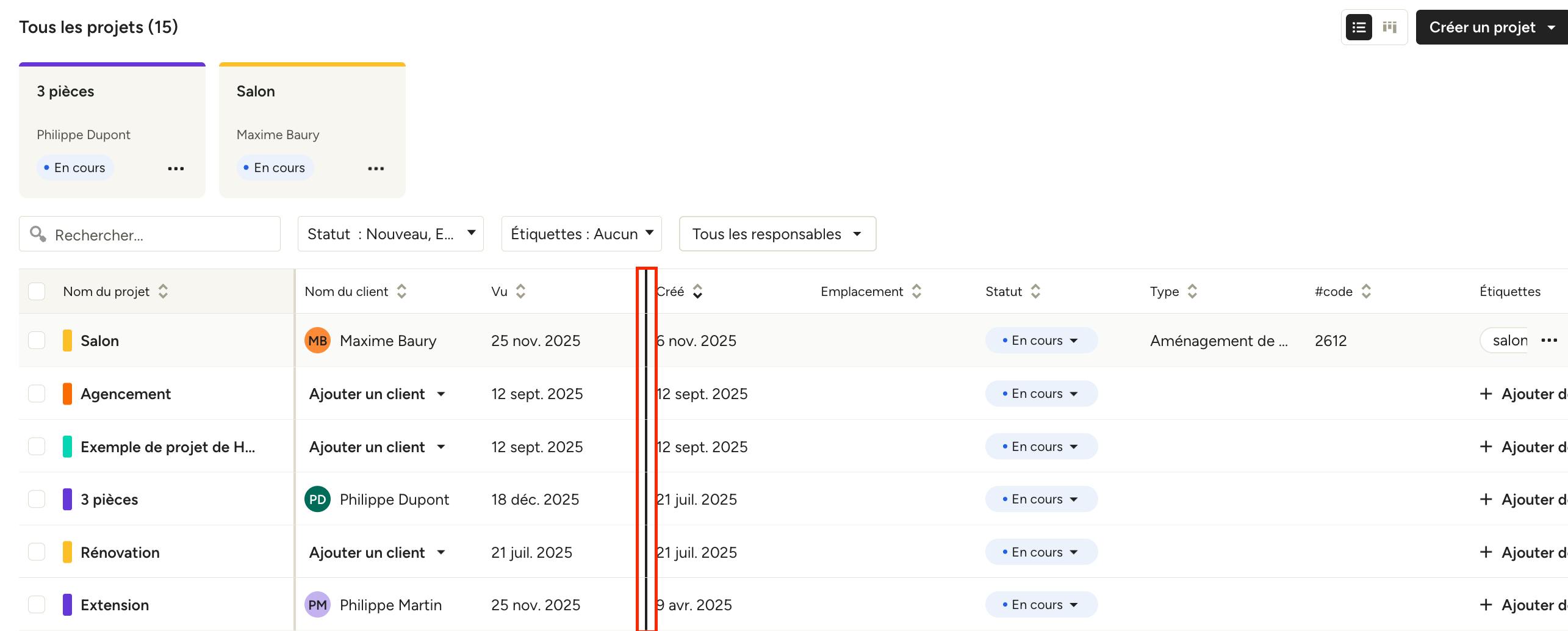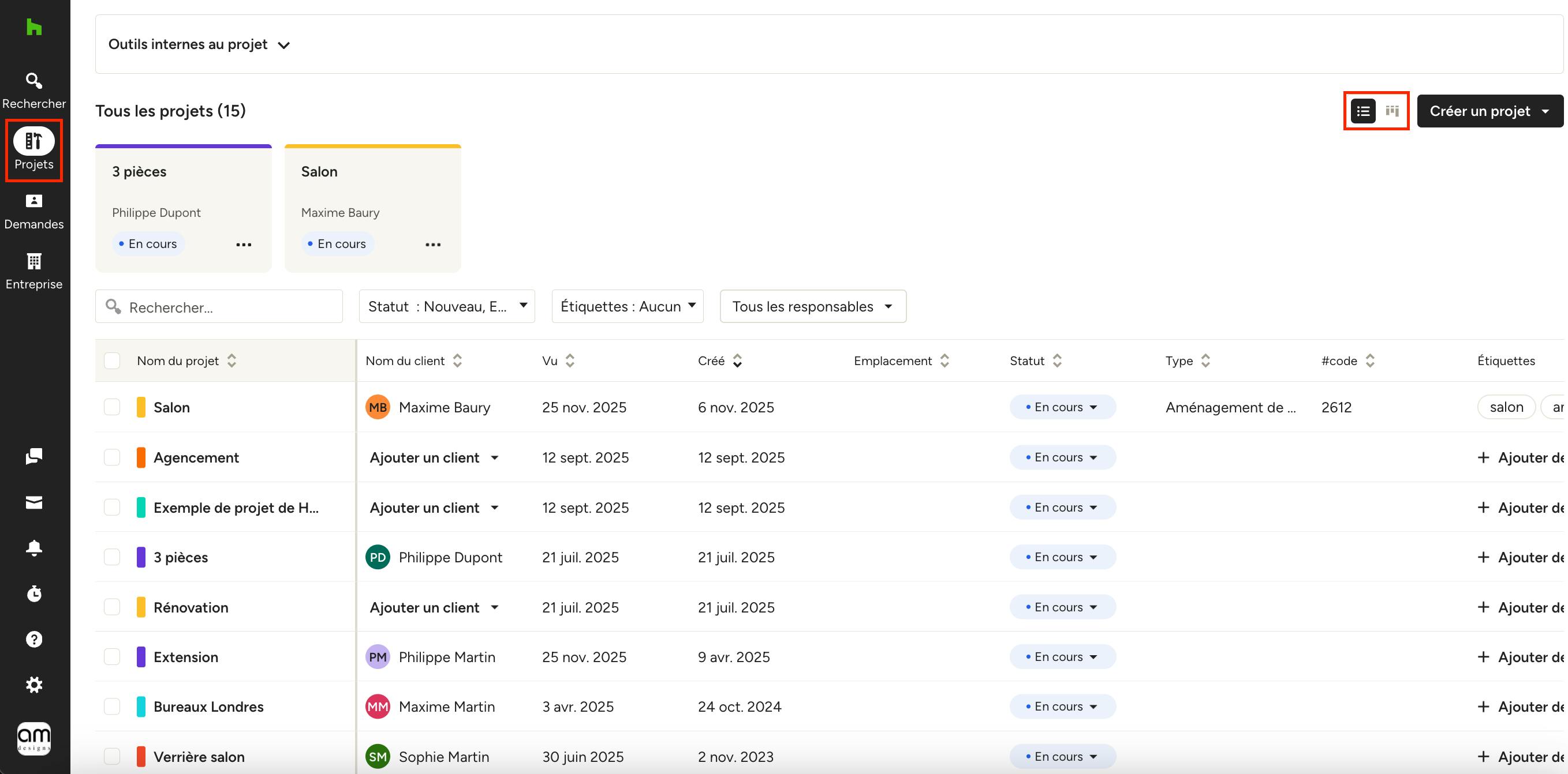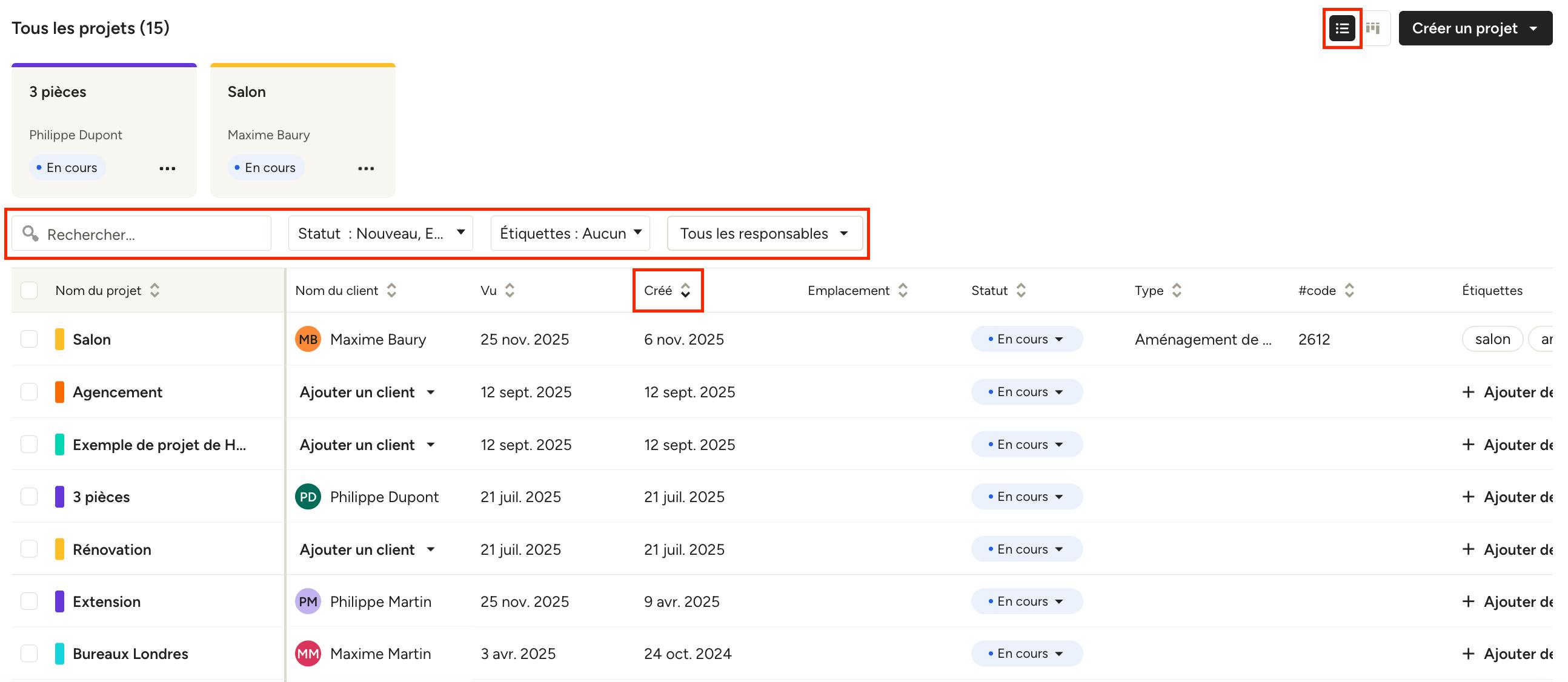 Sur cette page, vos projets sont organisés proprement pour que vous puissiez voir le statut de chaque projet en un coup d’œil. Pour chaque projet, vous verrez le nom du projet, le nom du client, les dates de création et de dernière consultation, l’adresse, le statut, le type de projet, le code du projet, les étiquettes du projet et les responsables de projet