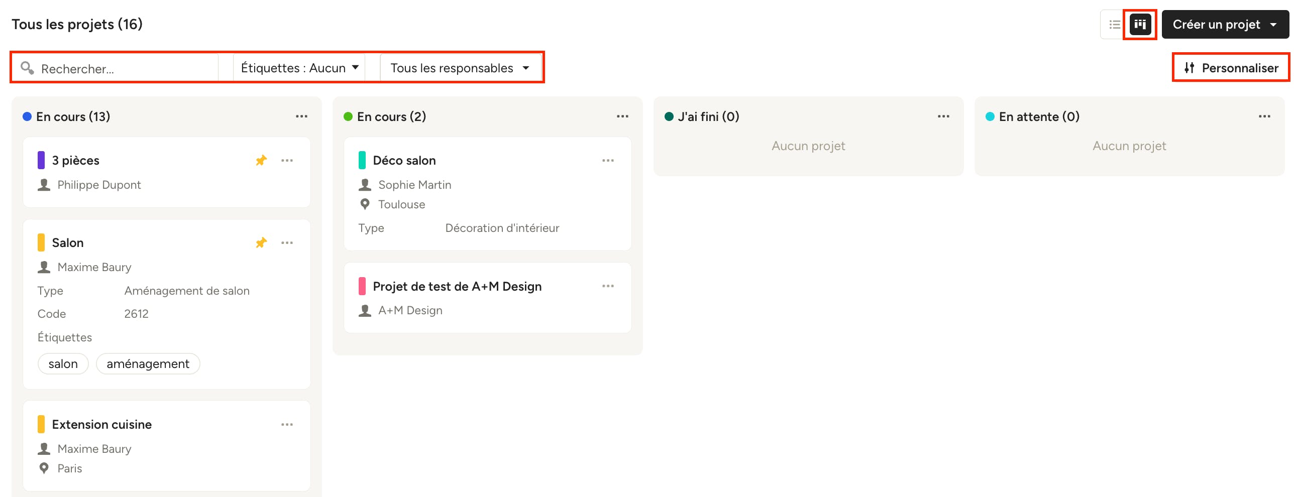 Dans cette vue, vous pouvez également rechercher par mot-clé et filtrer par étiquettes de projets ou responsables de projets. Vous pouvez glisser-déposer les projets pour modifier leur position dans une colonne ou même les déplacer vers une autre colonne.