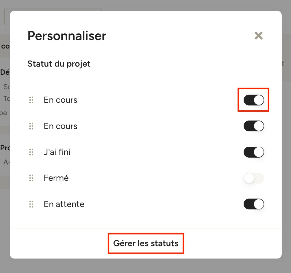 Un nouvel écran s’affichera, dans lequel vous pourrez activer ou désactiver les colonnes de statuts de projet disponibles. Si vous souhaitez ajouter un nouveau statut de projet ou modifier un statut existant, cliquez sur « Gérer les statuts » (pour en savoir plus, consultez cet article).