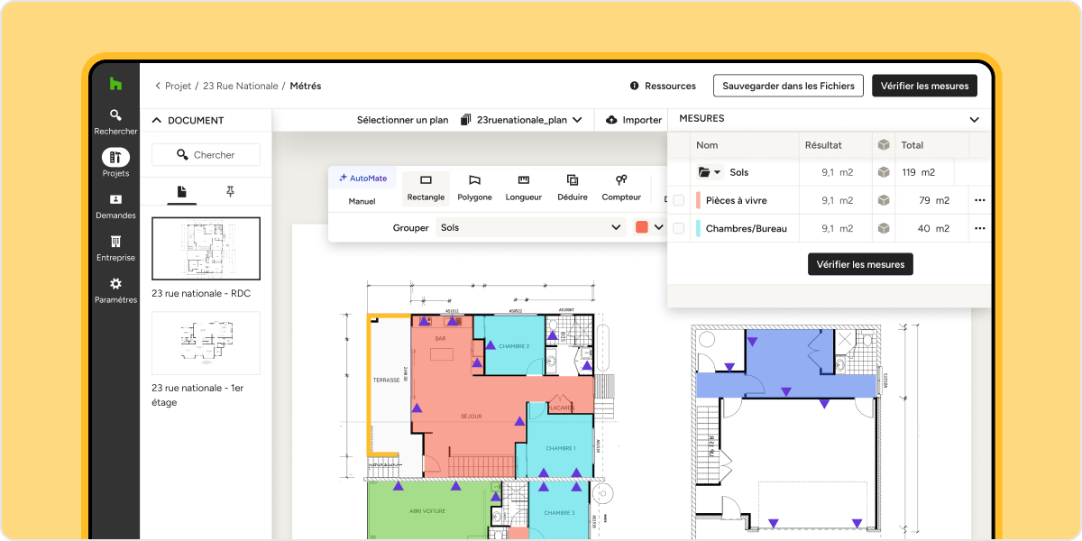 Automate analyse vos documents importés et repère les pages pouvant être mesurées automatiquement. Utilisez-le pour calculer des surfaces, des longueurs et même compter des éléments sur vos plans, ce qui réduit considérablement le nombre de mesures à effectuer manuellement.