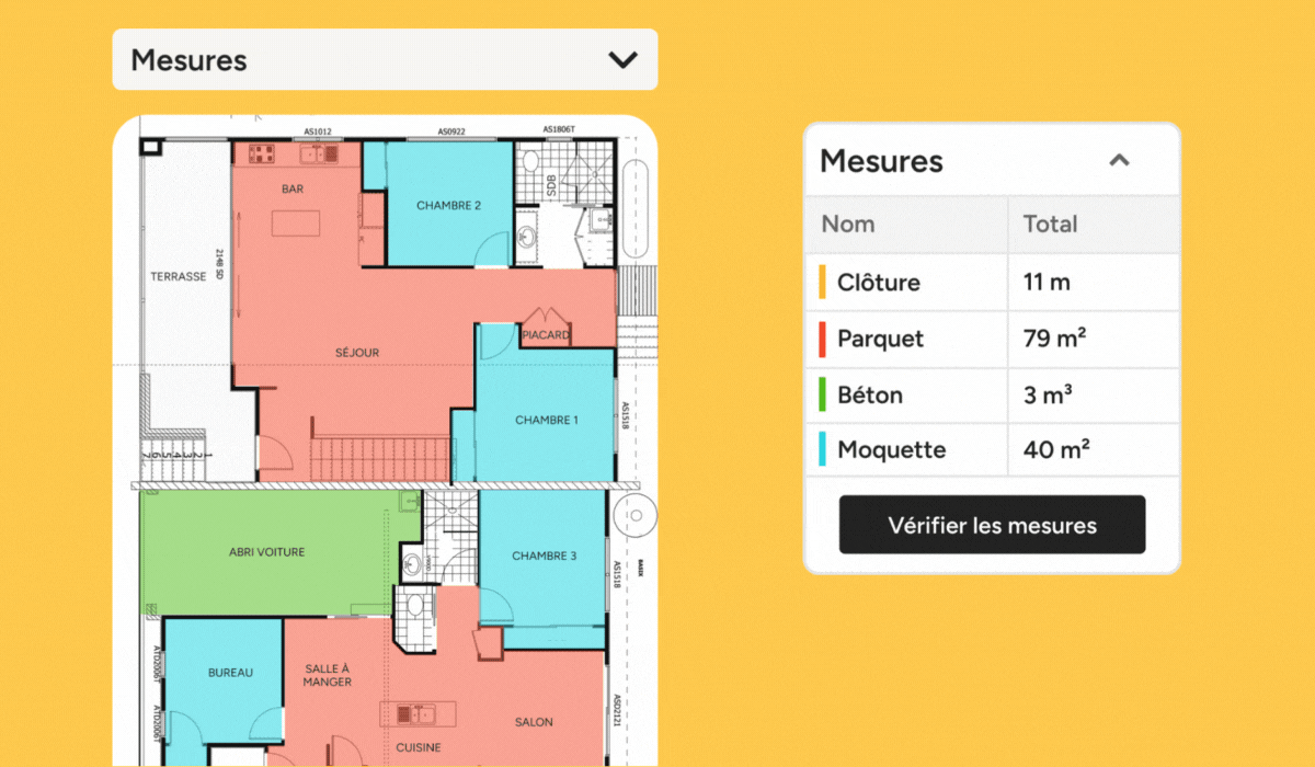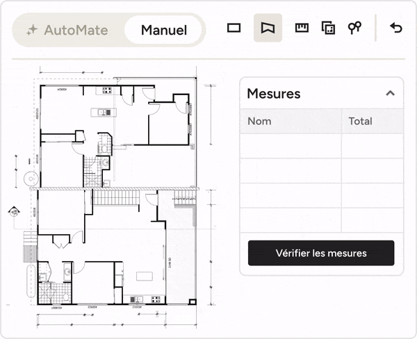 Cliquez sur l’icône de l'œil dans le panneau des mesures à droite pour masquer ou afficher les formes sur le plan. Pour masquer un calque spécifique, cliquez sur les trois points à côté de la mesure concernée, puis sélectionnez « Masquer le calque ». Cette astuce est très utile lorsque vous devez prendre des mesures pour plusieurs métiers ou matériaux sur une même page. Cliquez ici pour en savoir plus.